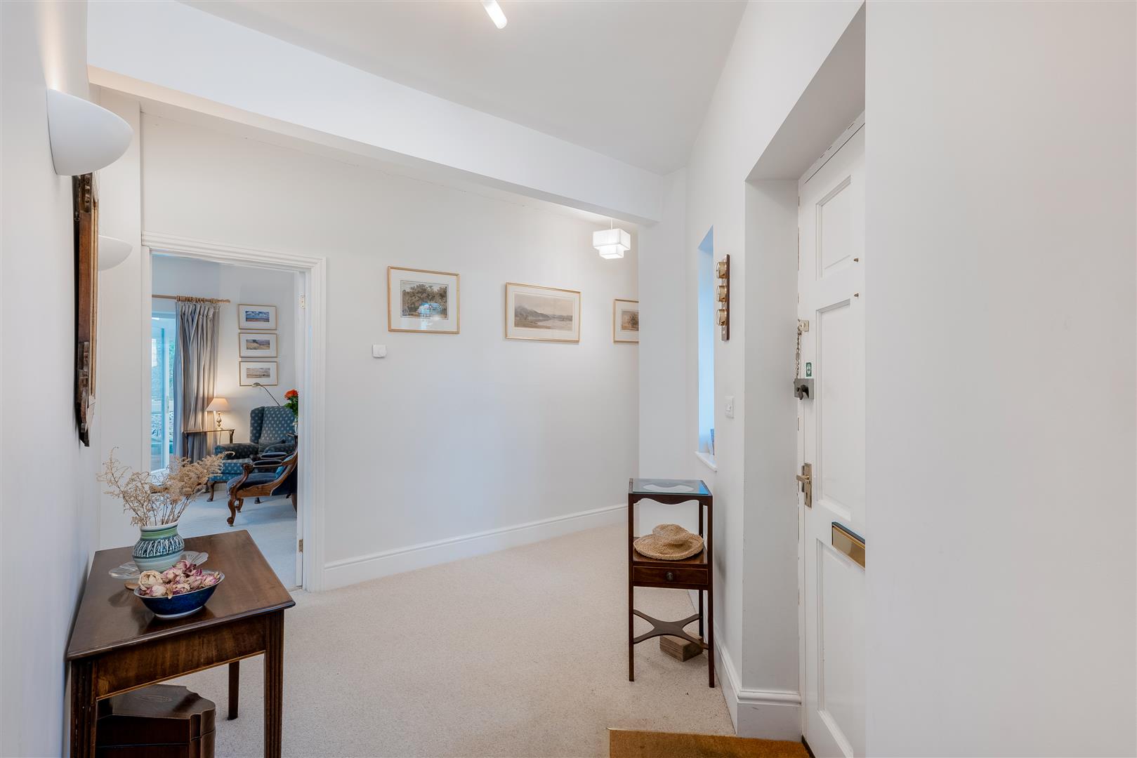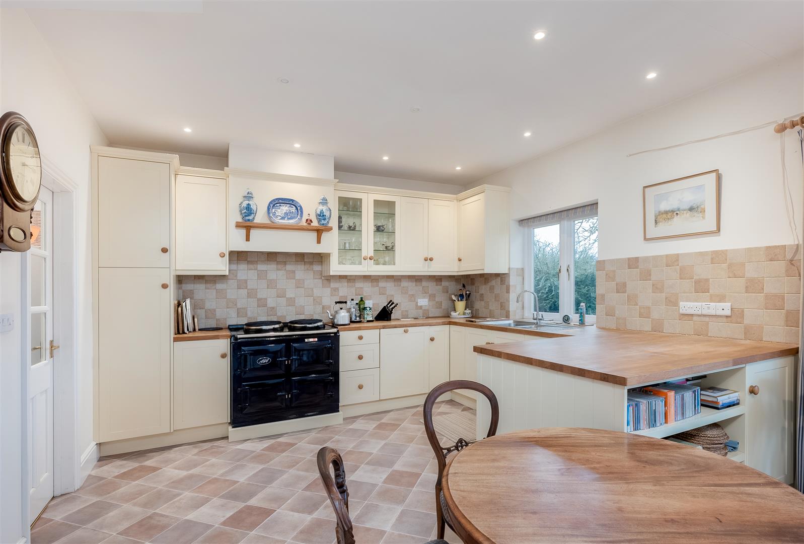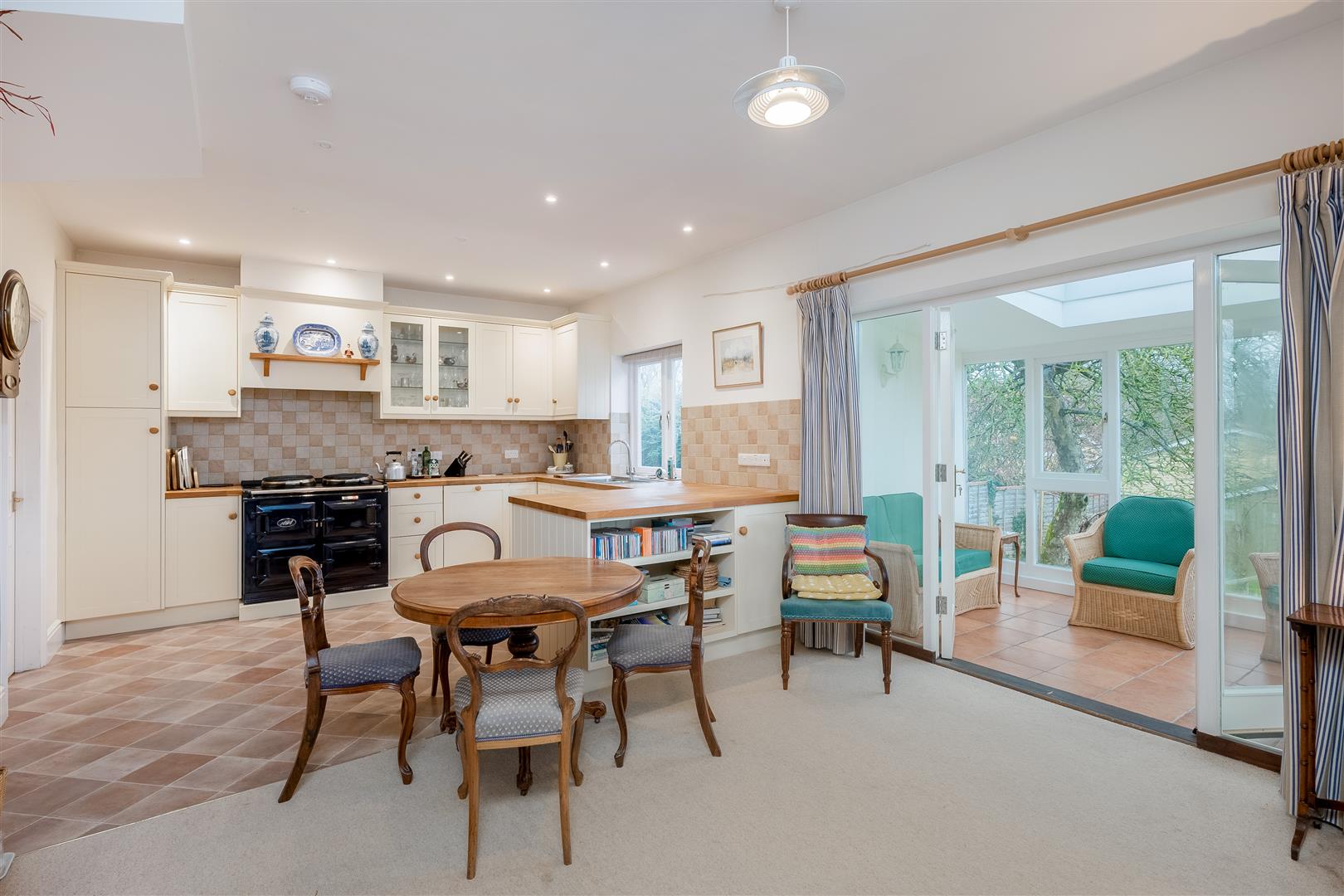An entrance porch with glass eaves provides a sheltered arrival space, with a tiled floor and plenty of natural light before opening into the main house. The front door opens into a spacious and light entrance hall, carpeted and providing a welcoming first impression. Straight ahead is the kitchen and dining room, a generous and well planned space with room for a large dining table and easy flow through to the garden room, study and utility. The Shaker style kitchen is fitted with an electric Aga, integrated dishwasher and fridge, and includes a useful pantry cupboard.