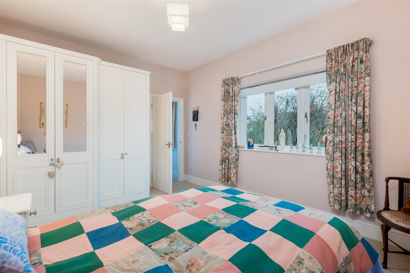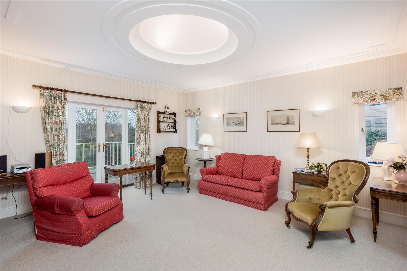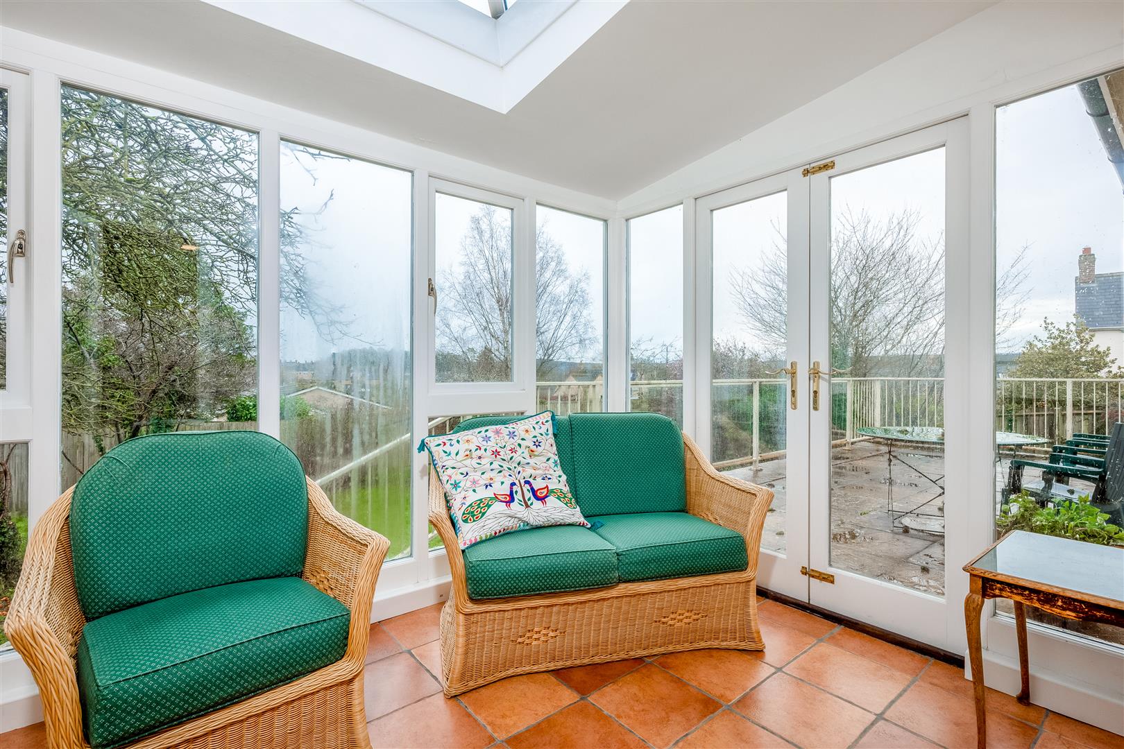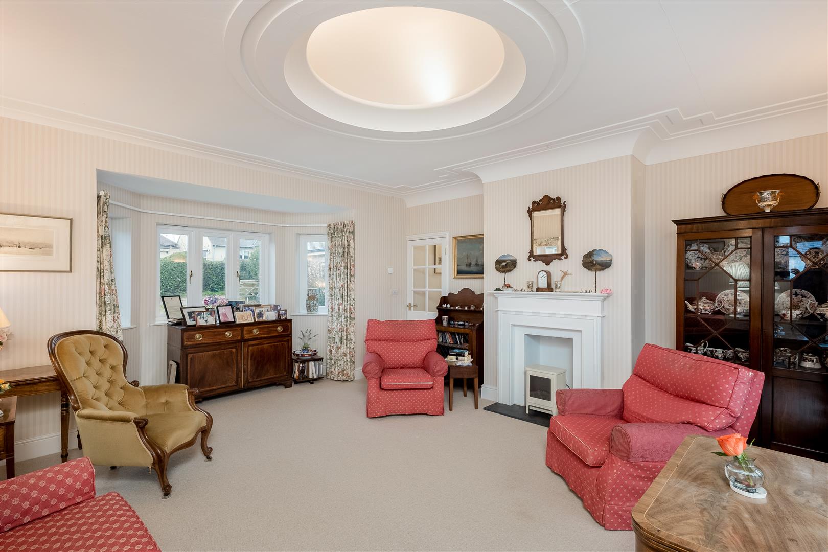 The garden room has a tiled floor, enjoys views over the garden and beyond, and benefits from underfloor heating, making it a practical year-round space. The sitting room is a particularly attractive room, filled with natural light from its triple aspect, featuring a bay window to the front, double doors opening onto the rear patio, a decorative fireplace and a distinctive domed ceiling detail.