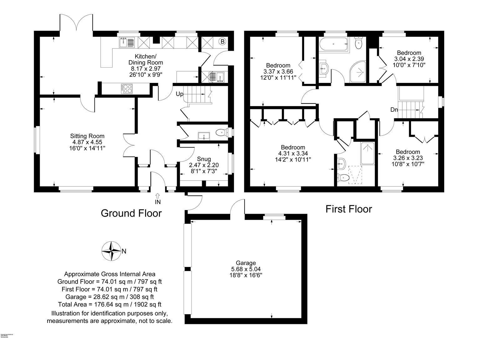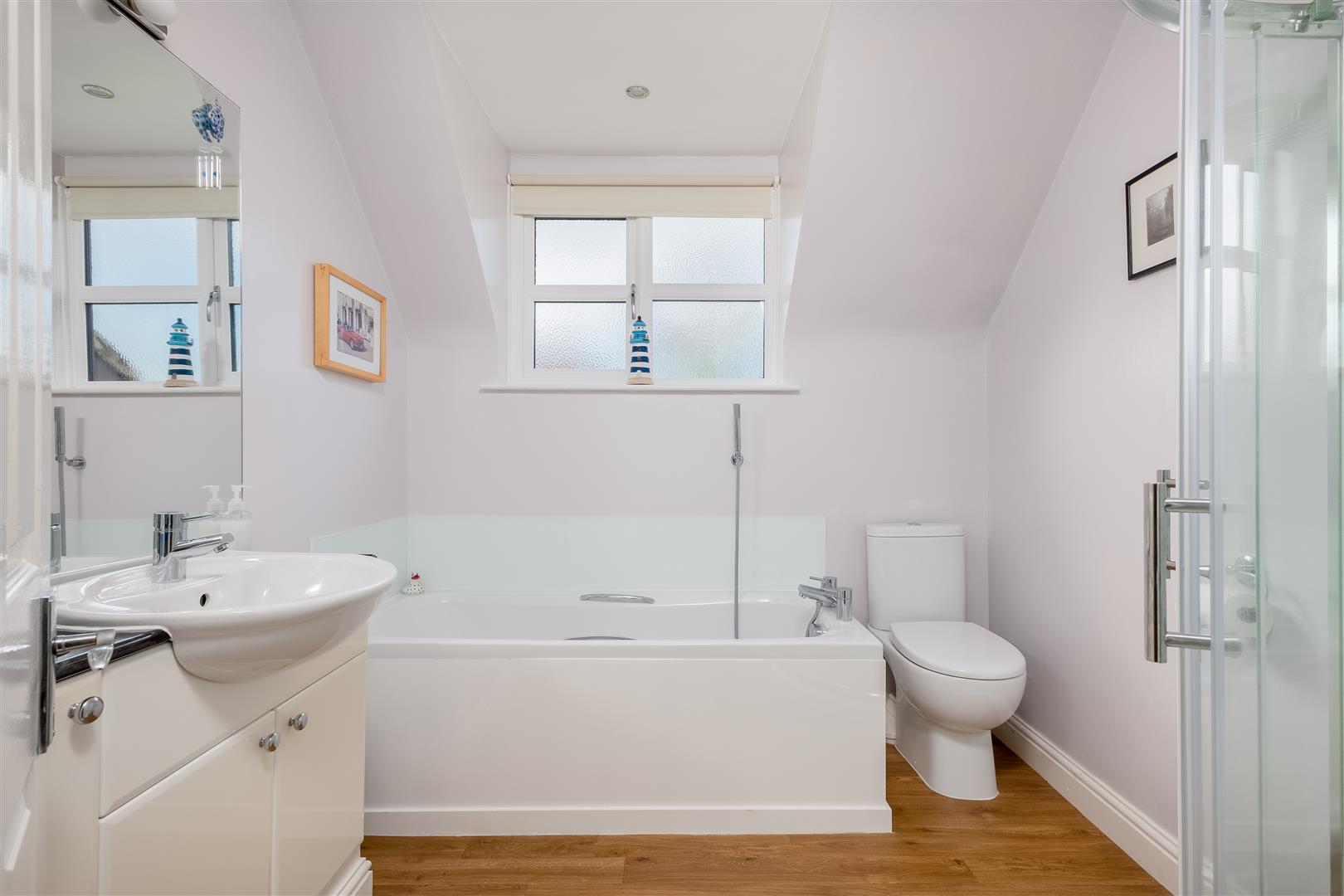 Upstairs, a spacious landing gives access to four double bedrooms, all with built-in wardrobes. The principal bedroom benefits from an ensuite shower room, while a family bathroom provides both a bath and separate shower.