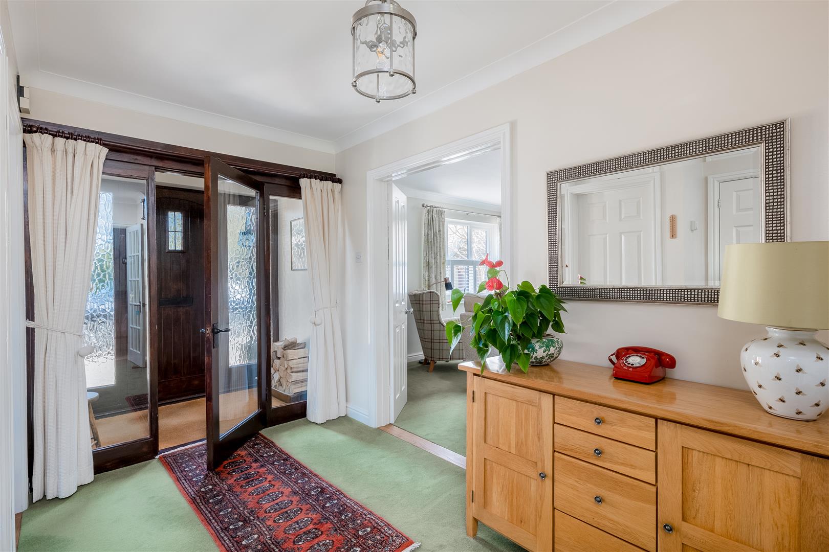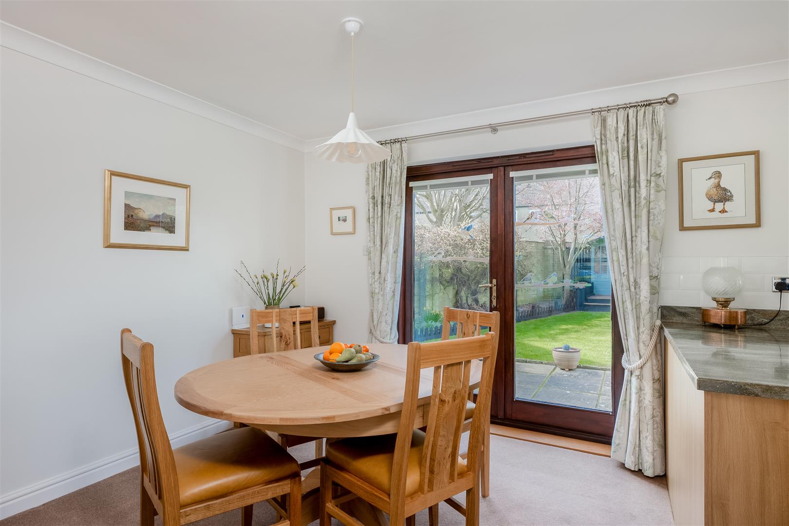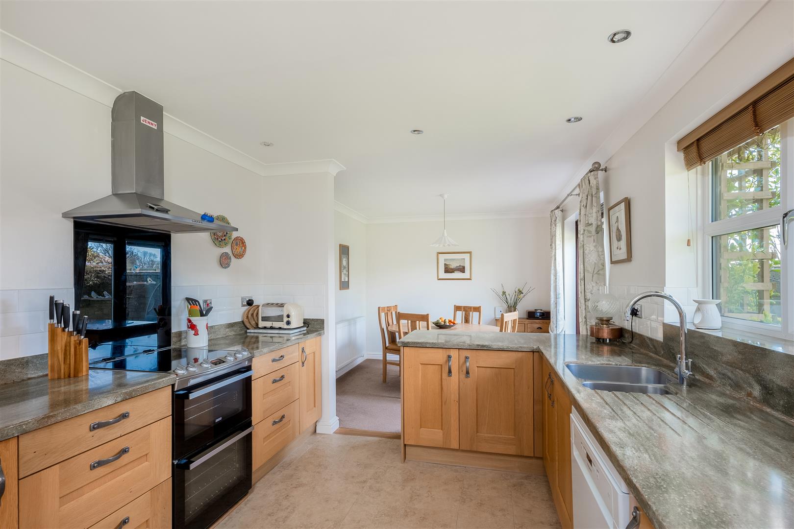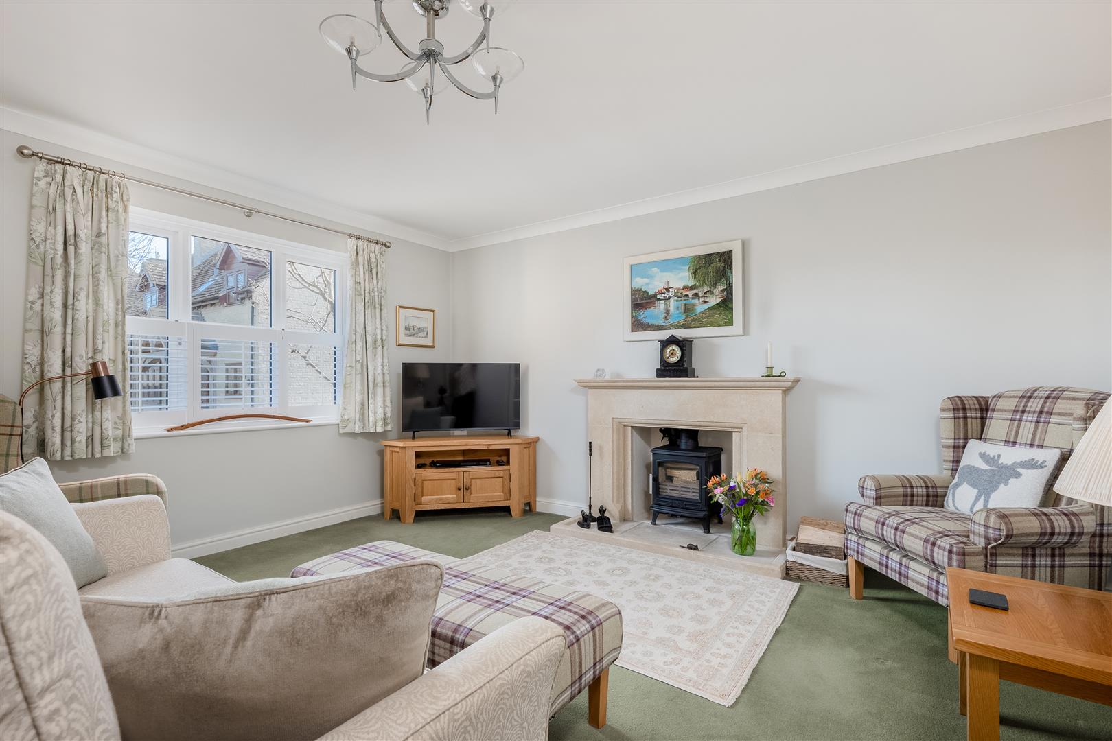 You enter via a porch into a spacious entrance hall, immediately conveying the care and attention this home has received. To the right is a cosy snug with built-in shelving and cupboards, ideal as a study or additional living space. To the left, double doors open into the sitting room, filled with natural light and featuring a log burning stove set within a stone fireplace, with shutters on the windows adding both privacy and style. The dining area flows seamlessly from the sitting room, accommodating a good-sized table and opening through double glazed doors onto the patio.