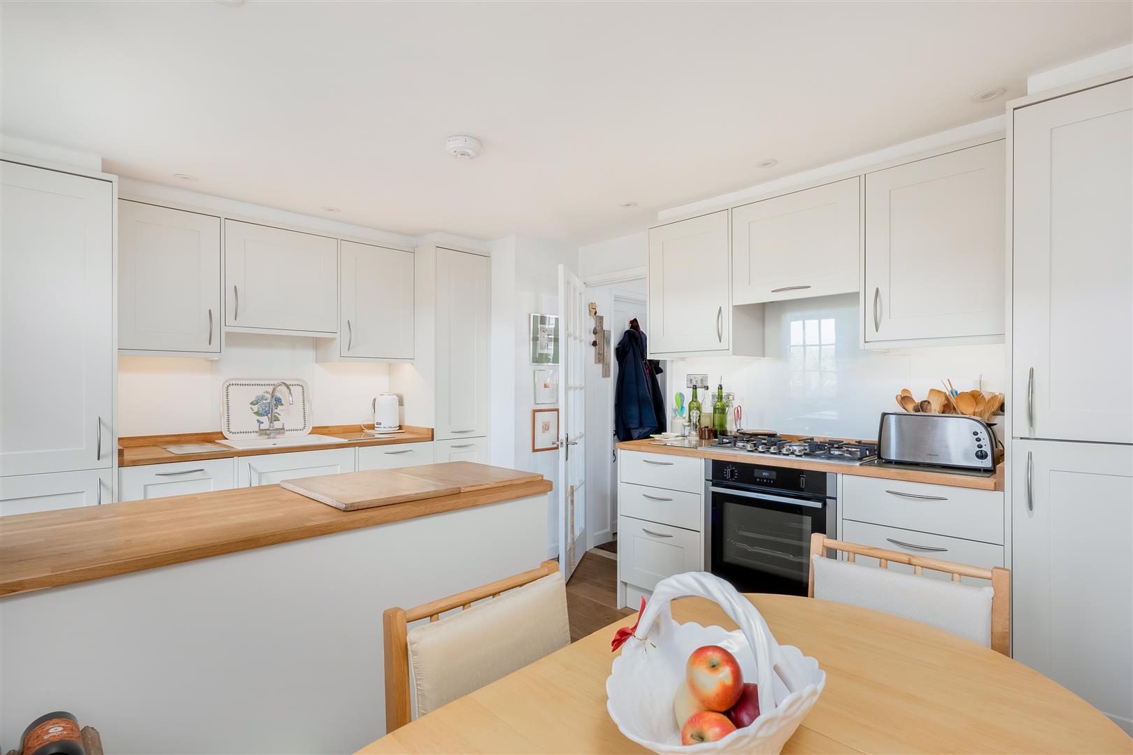 You enter into an entrance hall with access to a downstairs WC. Straight ahead, the kitchen/breakfast room is fitted with an integrated dishwasher and fridge freezer, gas hob and Neff oven, with space for a table and chairs and a door opening out to the rear. Further along the hall is a cosy sitting room, centred around a log burning stove, with a built-in desk neatly positioned in the corner, ideal for working from home.