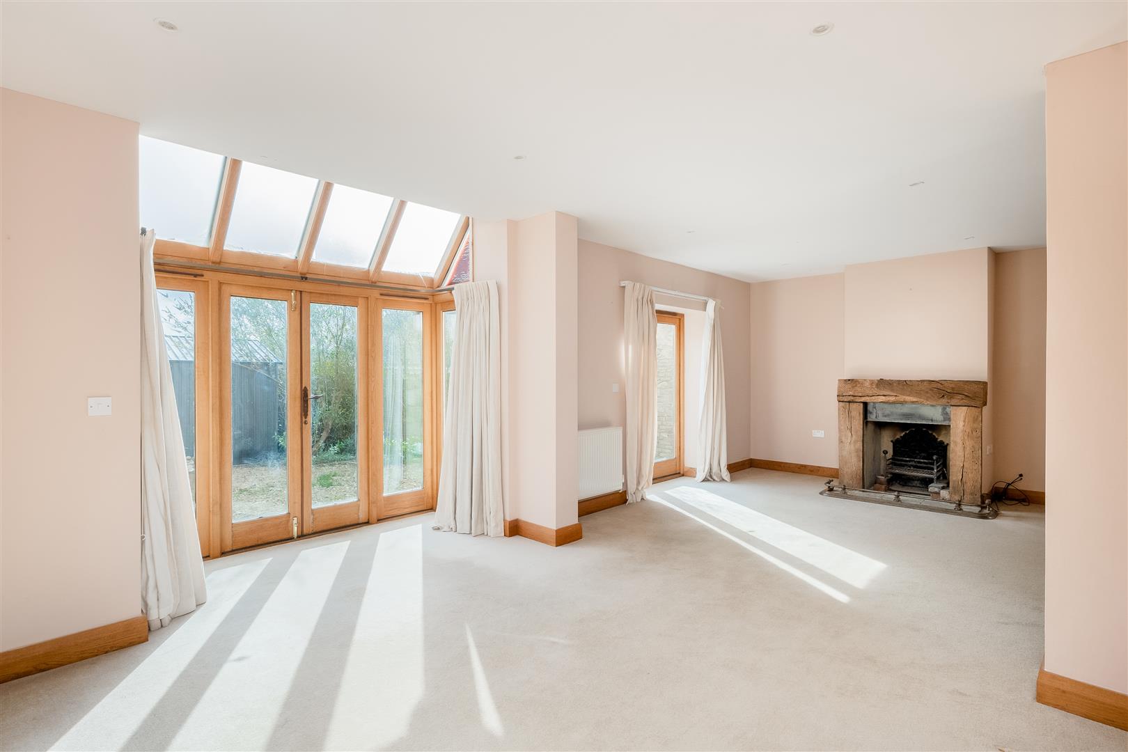 The main living space is a generous living and dining room centred around an open fireplace, creating a comfortable and inviting focal point. Two sets of timber surround, glass double doors open directly onto the garden, allowing plenty of natural light and providing an easy connection between the indoor and outdoor spaces.