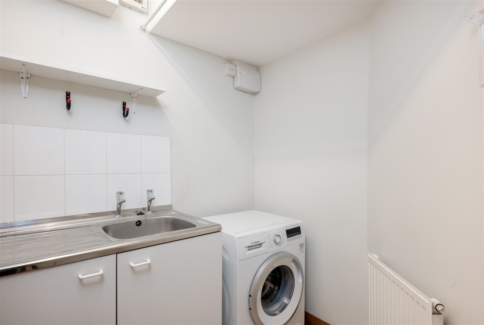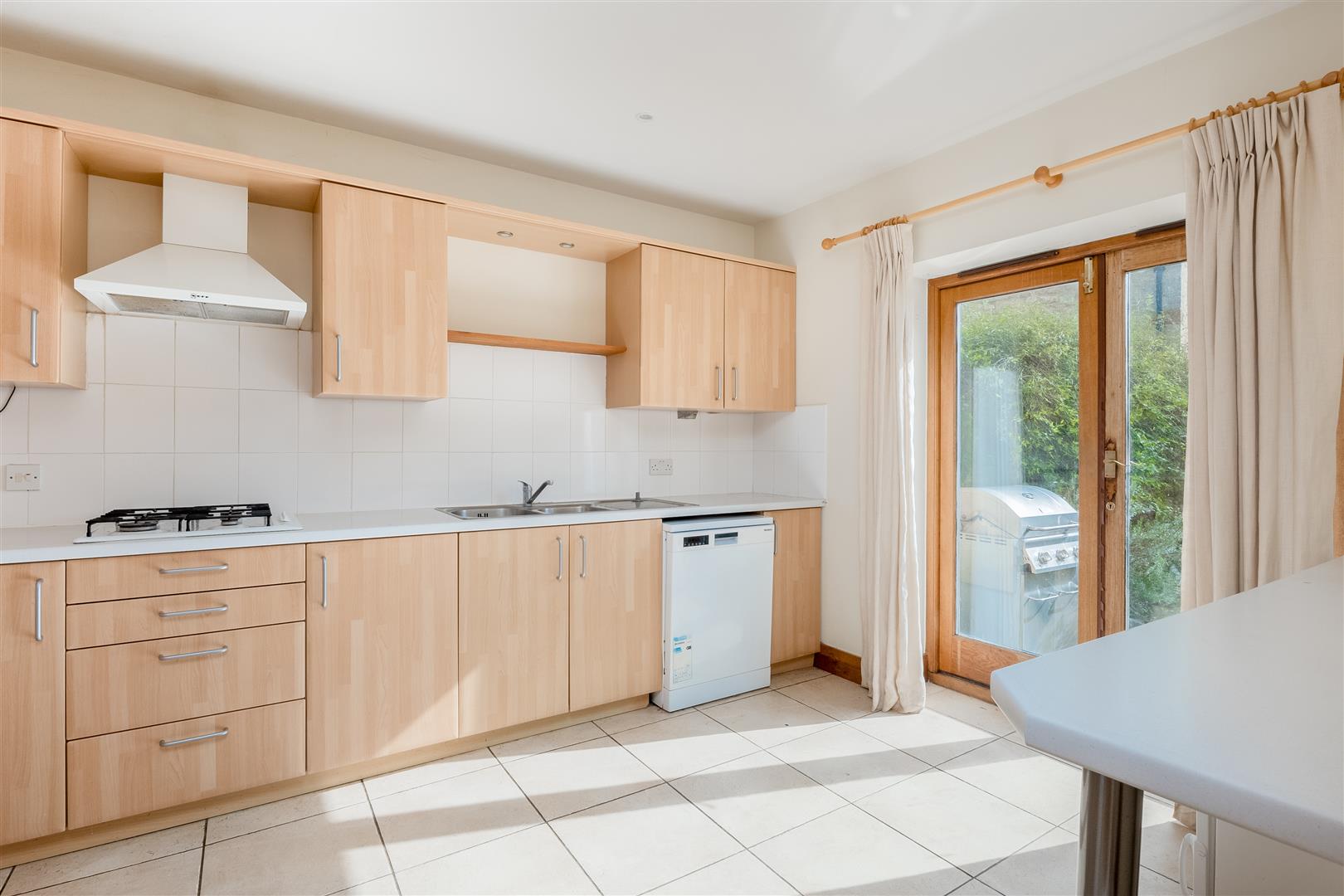 The kitchen is fitted with a gas hob and electric oven, with space for a fridge freezer and dishwasher. Double glazed doors with a timber surround open out to the garden, making it an ideal space for everyday living and entertaining.
